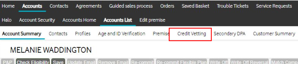 Xpath Error on credit vet: 1. From the customer comms tab, instead of clicking the ID, click the “Account Name”, highlighted below in RED. This will open the account in Siebel. 2. From the page that loads, scroll until you see “Billing Profiles” on ...