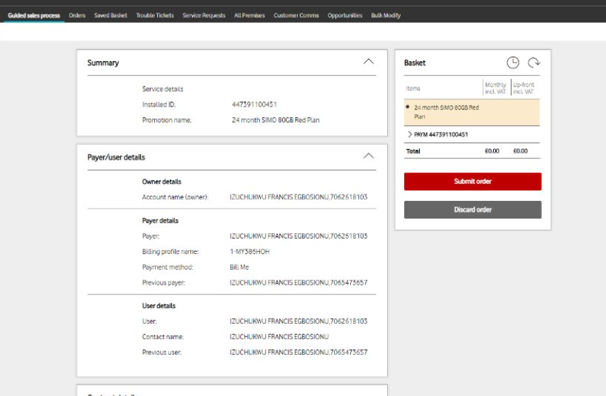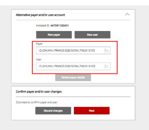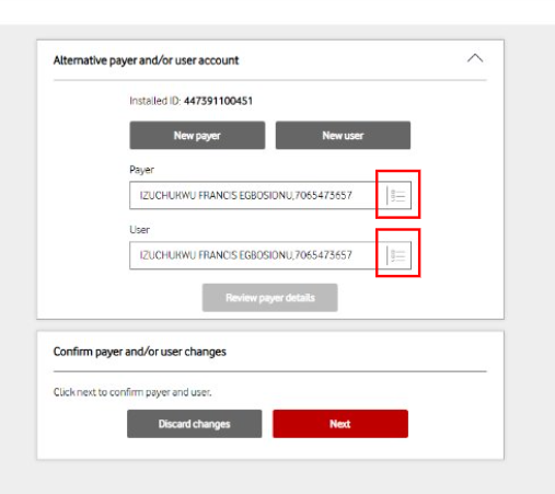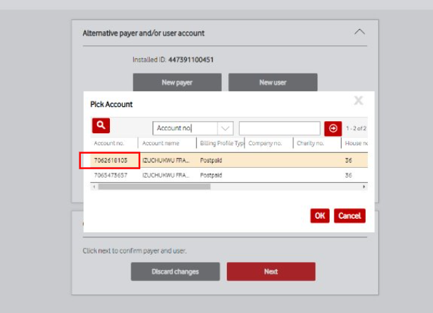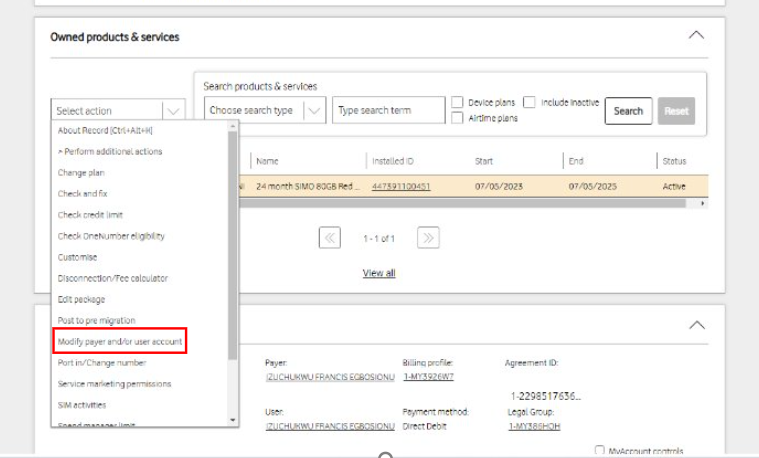 2.Once the page loads, make sure the same mobile number is listed. Then select “Modify payer and/or user account” from the dropdown menu